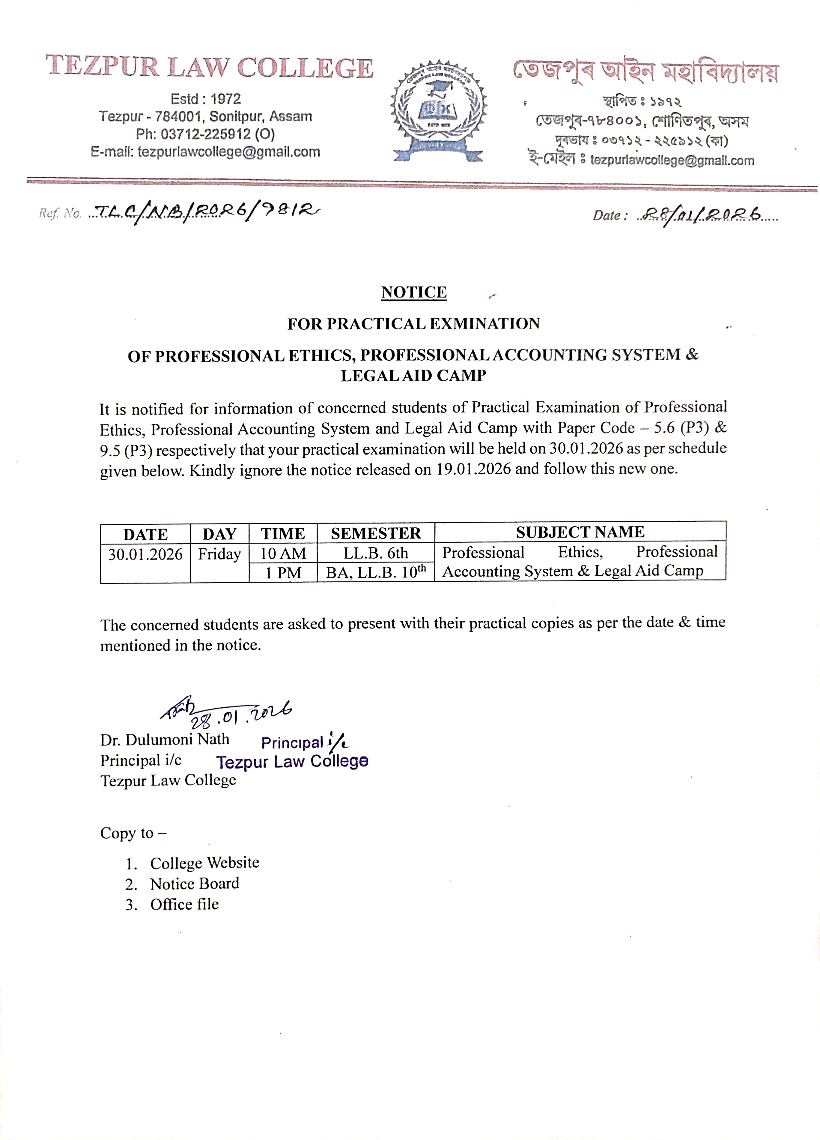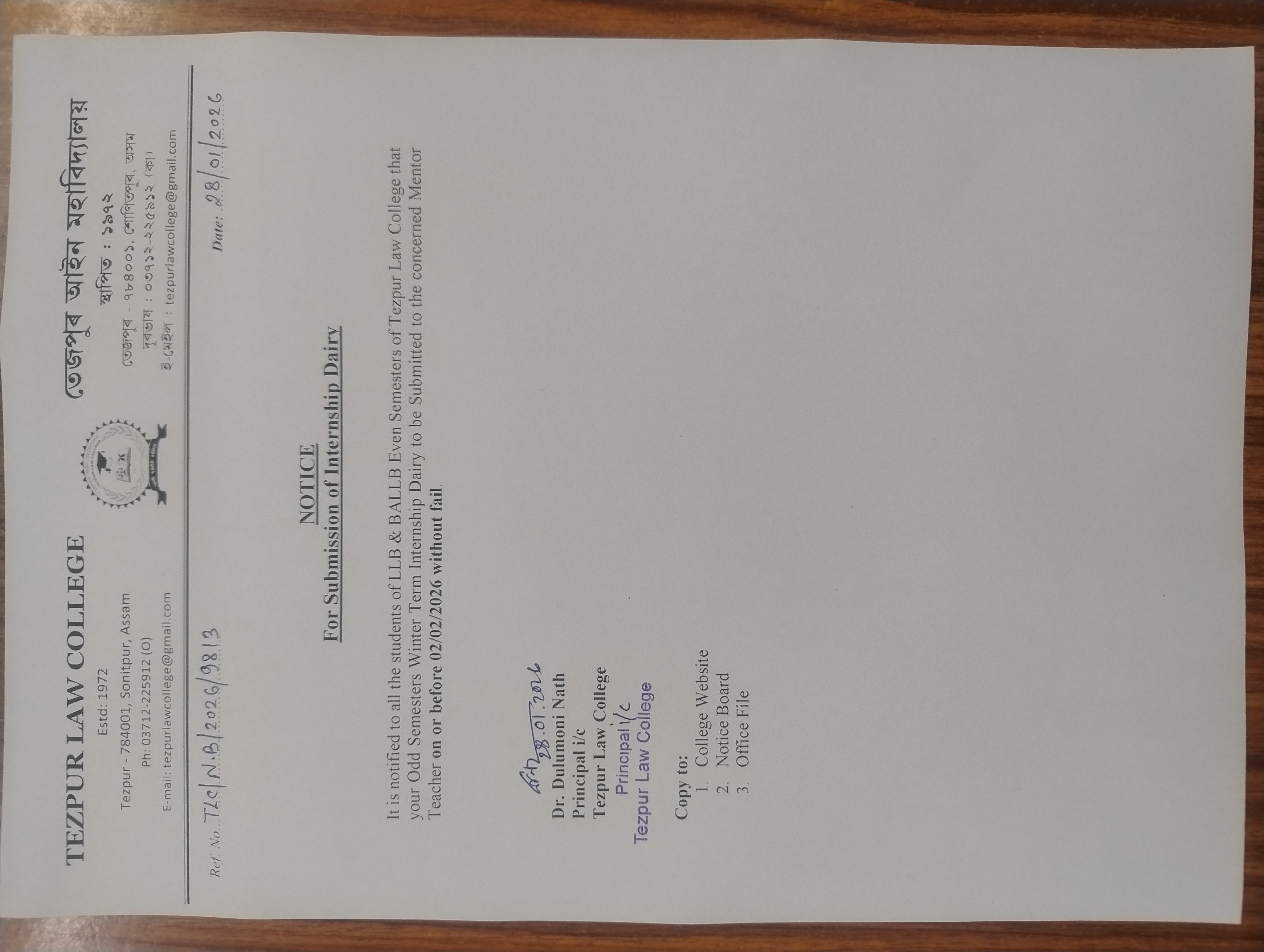 Reminder Notice for the students of LL.B 6th Semester and BA LL.B 10th Semester regarding submission of practical copies of the Subject Moot Court and Internship. View 2025-04-23
